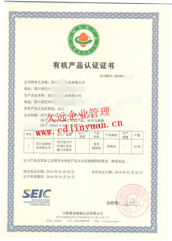 有機食品認證證書